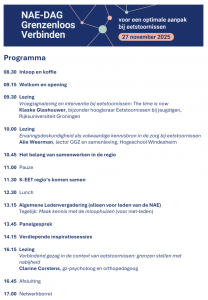 De NAE-dag van de Nederlandse Academie voor Eetstoornissen staat dit jaar in het thema van Grenzeloos Verbinden. Maar wat betekent het écht om grenzeloos te verbinden? Hoe integreer je dit in een optimale aanpak bij eetstoornissen? Je wordt meegenomen in dit onderwerp door persoonlijke verhalen, inspirerende sprekers en praktijkgerichte sessies. Komende maanden zullen de sprekers en verdiepende sessies bekend worden gemaakt.